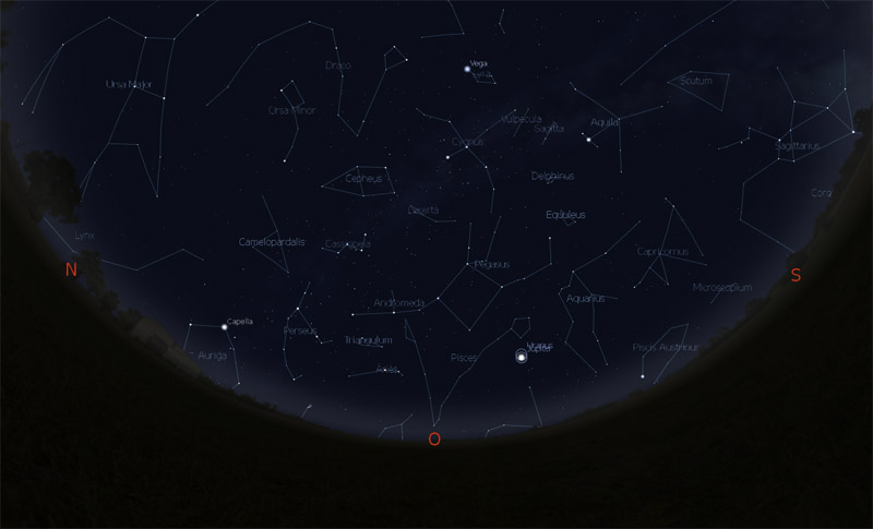 Weiter östlich ziehen bereits die Fische heran, gefolgt vom kleinen aber markanten Sternbild Widder. Weit im Nordosten hinter dem Sternbild Perseus wird am Horizont schon der Fuhrmann als ein erster Vorbote des Winters sichtbar.