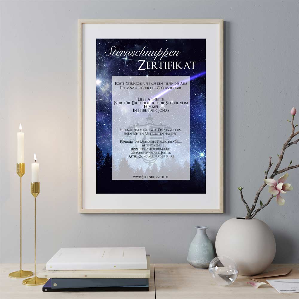 Bewahren Sie Ihr Sternschnuppen-Zertifikat immer gut auf! Mit einer Laminierung machen Sie Ihr persönliches Zertifikat unempfindlich gegen Verknicken, Fingerabdrücke und Feuchtigkeit. Durch die professionelle Heißlaminierung wird das Zertifikat stabil und abwaschbar und erhält so einen optimalen Schutz.