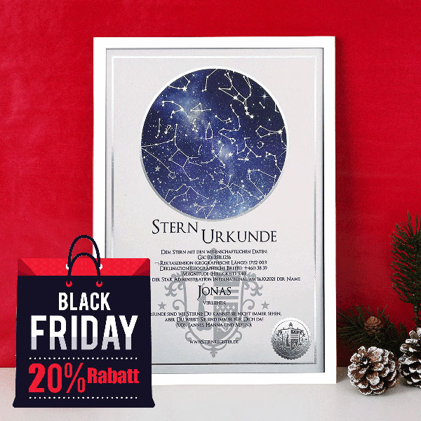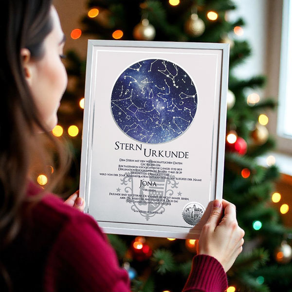 Die Sternurkunde ist das Herzstück der Sterntaufe: Sie dokumentiert ihren persönlichen Eintrag in das internationale S.A.I.-Sternregister®. Neben dem von Ihnen gewählten Sternnamen und dem Taufdatum sind auch die wissenschaftlichen Daten und Koordinaten Ihres Sterns auf der Urkunde angegeben. Optional können Sie Ihrer Sternurkunde auch eine persönliche Widmung hinzufügen – natürlich kostenlos.
