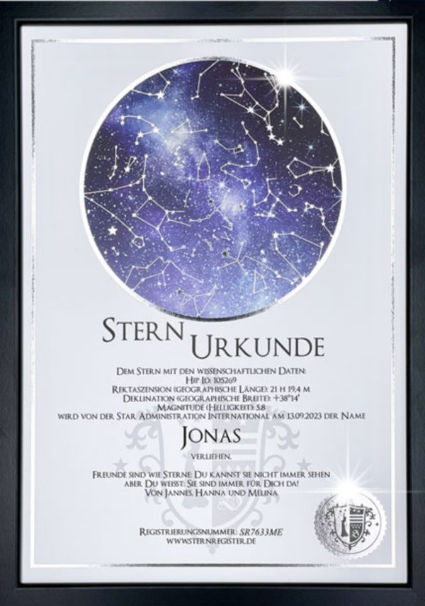 Der von Ihnen gewählte Sternname, das Taufdatum und die Koordinaten Ihres Sterns werden für sie auf den Stern graviert.